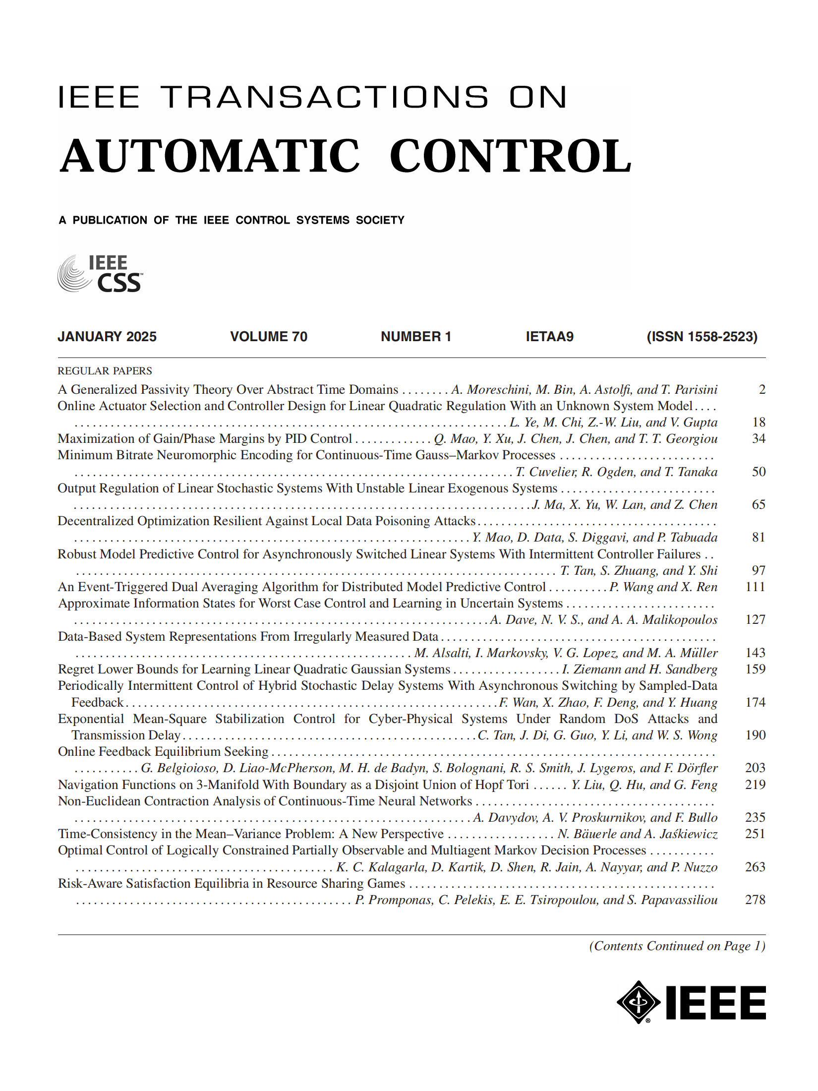 IEEE TAC是自动控制领域的顶级学术期刊,由IEEE CSS出版。该期刊专注于发表控制理论、方法与应用的高质量原创研究,涵盖系统建模、优化、鲁棒控制、自适应控制、网络化系统、机器人控制等方向。IEEE TAC以其严格的审稿标准和高学术影响力著称,受控制领域研究者高度认可,最新影响因子为6.2,属于SCI TOP期刊。